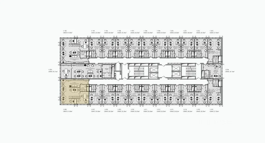 Офисные помещения площадью от 20,3 до 197, 03 кв.м. и высотой потолков 3 метрах находятся с 3 по 27 этаж.