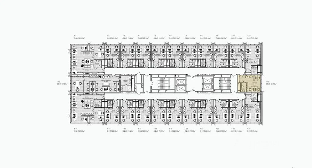 Офисные помещения площадью от 20,3 до 197, 03 кв.м. и высотой потолков 3 метрах находятся с 3 по 27 этаж.